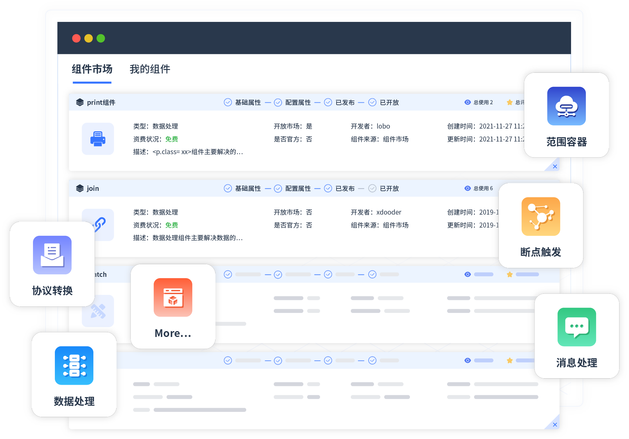 针对集成场景,,美团钱包商家版提供组件市场,,,例如协议转换、、、、消息处理、、、、文件操作等。。。除平台提供的组件外,,,,客户可以自定义所需组件。。。